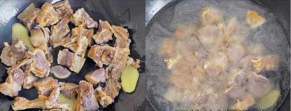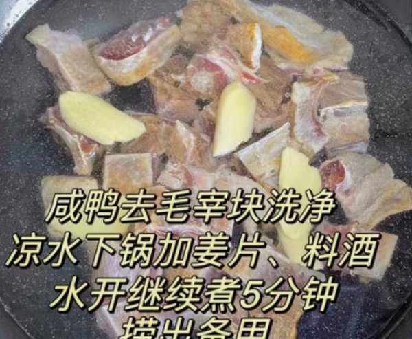 步骤2:生姜都切成片状,另外起锅放入咸鸭肉,记得要冷水下锅,放入一些冷水没过食材,加上少许料酒,水开煮5分钟,捞出用清水冲洗干净,控干水分备用。