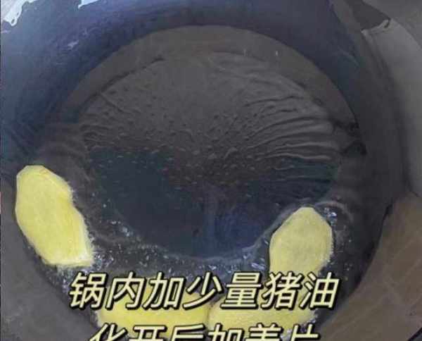 步骤4:起锅烧热加上猪油少许,将猪油都融化开,加上一些姜片爆香,倒入咸鸭肉快速煸炒,将鸭肉炒至变色。