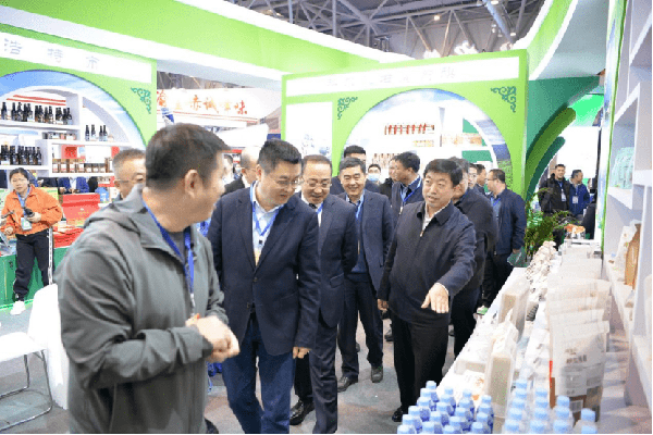 这是北京市支援合作办副主任汪兆龙、内蒙古自治区乡村振兴局副局长海山等与会领导和嘉宾走进内蒙古兴安盟展厅,兴安盟乡村振兴局局长周文推荐兴安盟名优特农畜产品。郝剑 摄