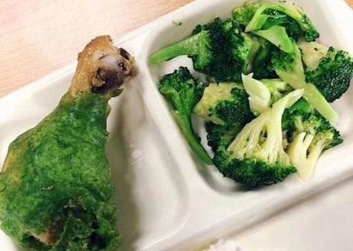 中午在食堂吃饭的时候,这个是朋友给我打来的饭菜,虽然这回有肉了,但是鸡腿上面糊上了一层绿绿的东西,看上去就让人有一点没食欲,刚开始我还以为朋友单纯的想请我吃饭,后来想想有点不对劲,不知道是不是我想多了,为什么朋友请我吃的这些都是绿色的呢?想到这个我都快哭了!