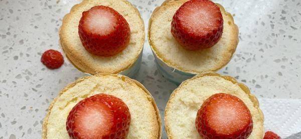15.把cupcake的顶部切平,把头上的草莓切开放在蛋糕中间。