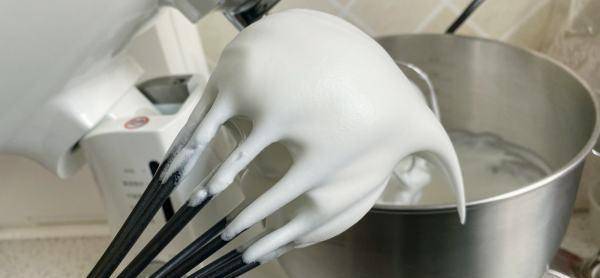 8、装好厨机桶,启动厨师机高速打发,打发过程中,分3次在蛋白中加入60克细砂糖,将蛋白打至硬性泡沫状,如图图。