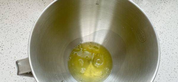 7、制作蛋白霜:将蛋白放入无水无油的厨房机器槽中。注意装蛋白的容器一定要无水无油,否则蛋白会变成奶油状无法使用。