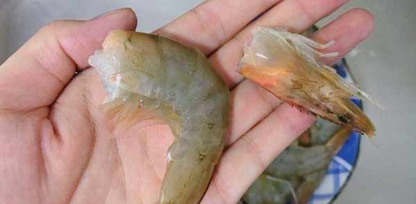 第三步:虾头捏掉,选虾线,虾尾用酒和盐腌一下,加入姜末腌12分钟。