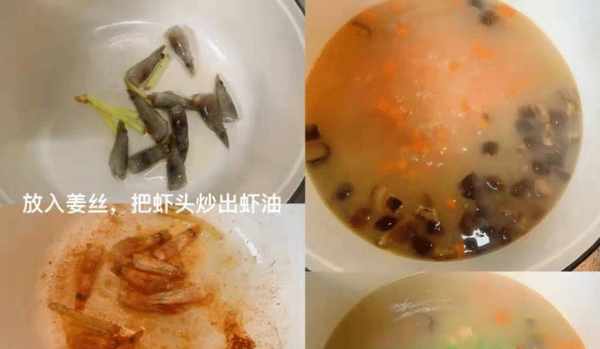 第四步:提前将米洗净,姜片放入锅中,加入虾头和虾油边搅拌边炒,加入足量的水烧开,将虾头全部捞出。