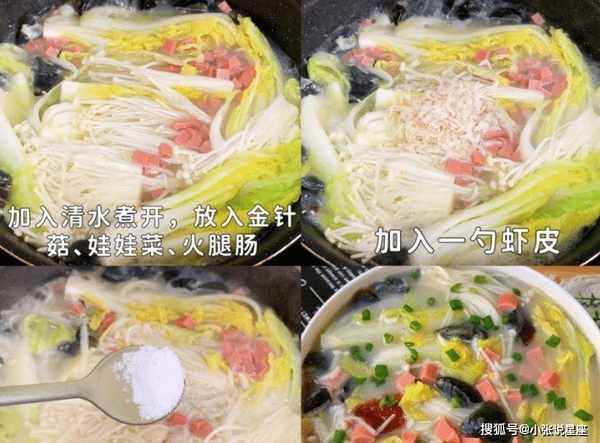 第六步:放两大碗水烧开一会,加入娃娃菜、金针菇和火腿肠,加入泡好的虾皮小火煮5分钟左右。