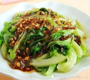 5、锅内放入适量油,倒入蒜蓉炒香,再倒入调好的淀粉水,翻炒到酱汁变稠,最后把蒜蓉和酱汁淋在生菜上即可;