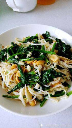 2、起锅烧水,水开后放入食盐和食用油,再放入金针菇焯水两分钟,煮熟后捞起来挤干水分放入碗中。接着放入菠菜焯水一分钟,煮熟后捞起来挤干水分放入装金针菇的碗中。