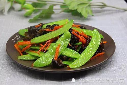 3、爆炒荷兰豆片刻,加入胡萝卜丝翻炒,然后加入炒熟的木耳,放盐炒均即可。