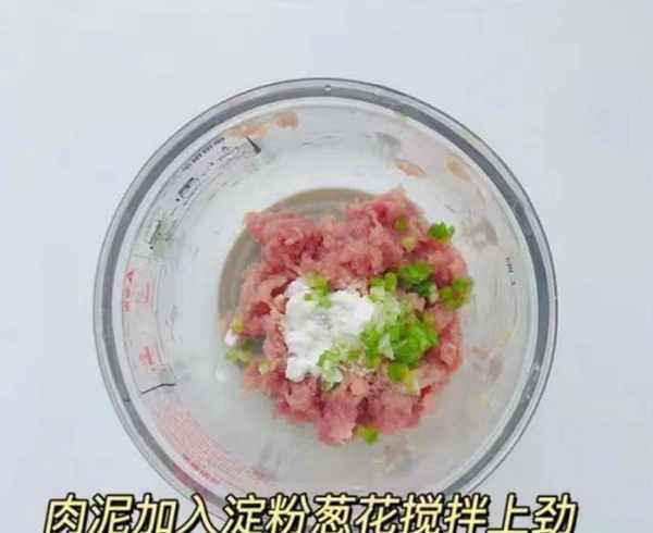 第四步:将猪肉馅放入碗中,加入一勺料酒,加入半勺蚝油和生抽,加入生粉,加入少许小葱,用力搅拌静置20分钟。