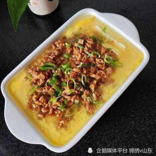6:炒好的肉末倒在蒸5分钟的豆腐上,这时候蛋羹已经定型了,盖上盖子接着再蒸2分钟就可以了。出锅以后,撒上适量小葱点缀,再倒少许生抽进去调味就可以了。
