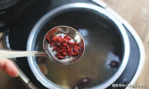 第六步:加入一些枸杞煮一会,加盐调味,少许味道很鲜,用勺子搅拌几下,尝尝咸淡。