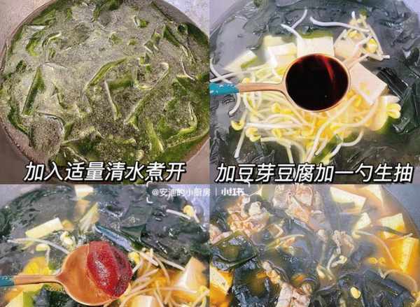 准备食材:准备约50克裙带菜(裙带菜是海鲜干,泡水后体积增大数倍。裙带菜很像海带,但不是海带。裙带菜可用于凉拌和做汤),购买豆腐一块(软豆腐很适合煲汤),牛肉卷半盒,豆芽一小把,水少许,热水少许,小葱少许,色拉油少许,辣椒油少许,少许鸡精和胡椒粉,一盒浓汤,少许辣椒酱,一勺生抽等调料。烹饪技巧:要买好的裙带菜、优质的肥牛卷、豆腐和豆芽。肥牛肉应事先焯水。裙带菜肥豆芽豆腐汤的制作技巧需要掌握,难度相对较低。
