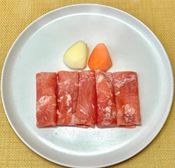 第一步,土豆、胡萝卜和肥牛卷,将肥牛卷冷水化开,锅中倒入适量清水,加入姜片和料酒,然后将肥牛卷放入锅中汆烫捞出鱼肉.肥牛卷的香味,用冷水浸泡,冲洗泡沫层,控制水分。