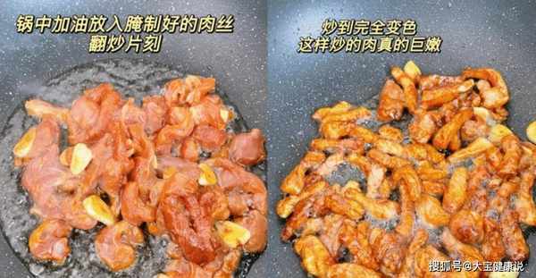 第四步:不粘锅加入适量的油,放入腌好的瘦肉,大火快速搅拌,让肉片慢慢变色,这样炸出来的猪肉才变得香嫩可口.