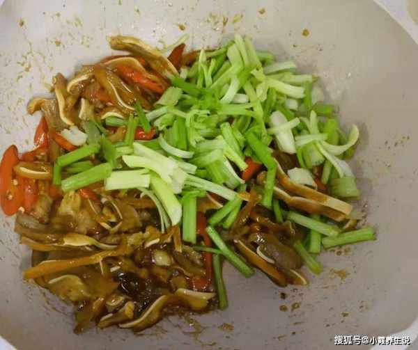 第六步:用几块芹菜炒香,加少许香油,尝一下菜的咸淡,酌情加入调料,收汁出锅,装盘,这道香辣炒肉丝很好吃,做好了,有坚果的味道,麻辣鲜美,下饭特别下饭。