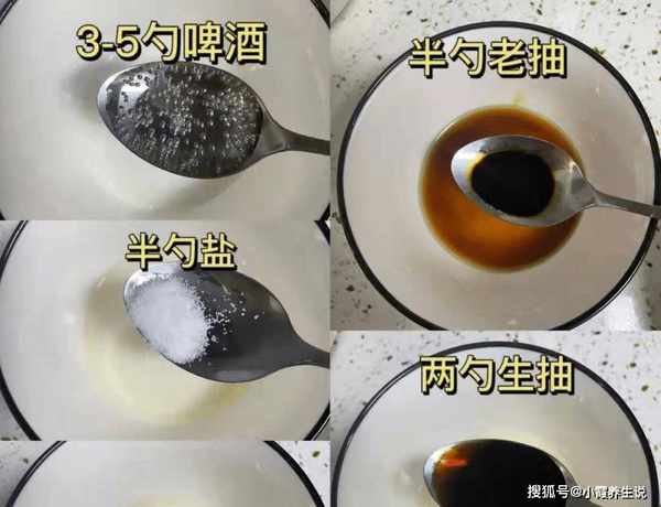第四:提前调配一下料汁,加上啤酒5勺,一勺生抽,半勺老抽和少许食盐,白糖一勺,将其搅拌均匀。