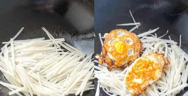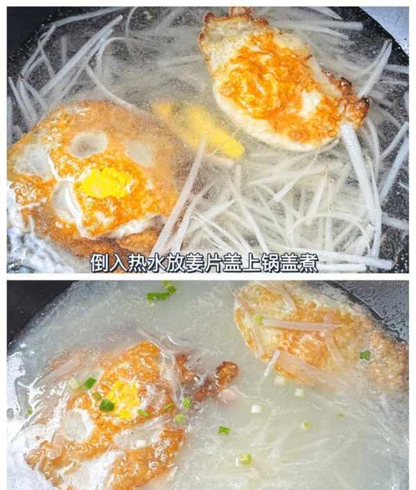 ③:锅底继续下油,放入切好的姜丝和萝卜丝,快速把切好的萝卜丝炒软,加入之前煎好的鸡蛋,加入两大碗温水,这样颜色萝卜汤会更白。