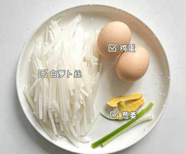 准备食材:准备白萝卜300克(白萝卜当季最甜,适合煲汤),买真鸡蛋2个,大葱3根,姜几片,温水两碗,花生油少许,胡椒。和一些盐。