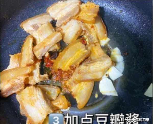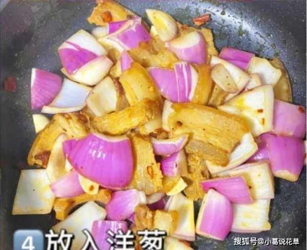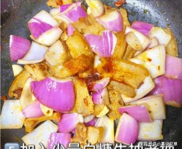 第五步:加入半勺豆瓣酱,快速翻炒片刻,加入洋葱块,加少许糖,加少许生抽和老抽,用木勺翻炒几下.