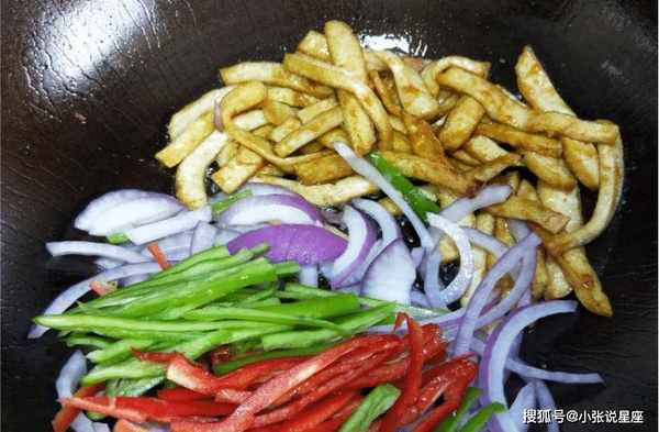 第六步:加入切好的青红椒,加入切碎的洋葱翻炒片刻,倒入炸好的肉末,加入酱油提鲜,快速翻炒几下。