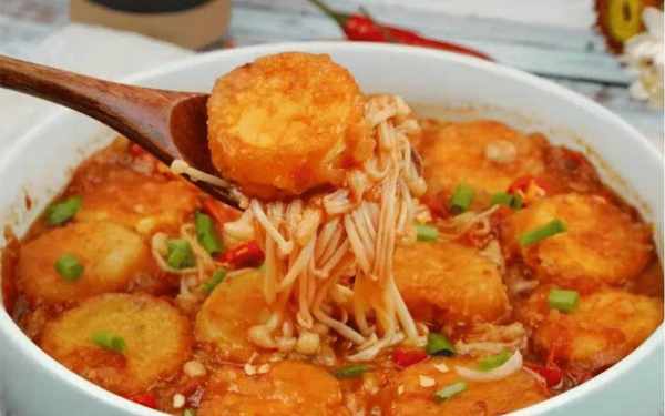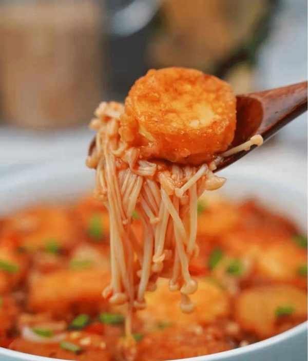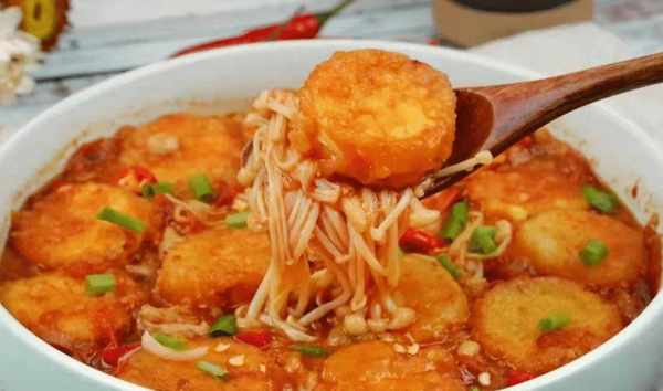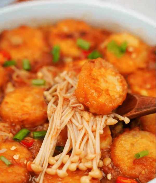 5:放入炸好的日本豆腐和金针菇,中小火煮4-5分钟,让日本豆腐煮熟入味,加少许水淀粉勾芡。