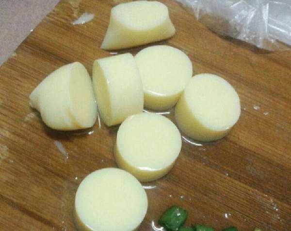 1:将日本豆腐切成等厚薄片,表面抹一层淀粉,锅烧热,加入少许油,中小火将日本豆腐煎至表皮剥落,同时侧面是金色的,将其取出。
