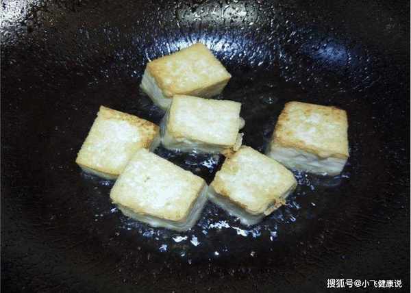 第四步:买来的软豆腐用冷水浸泡,捞出切成小块,锅中热油,撒盐,将豆腐沥干后入锅炸,将豆腐炸至变色。微黄,翻面继续翻炒一会,炸好后备用。