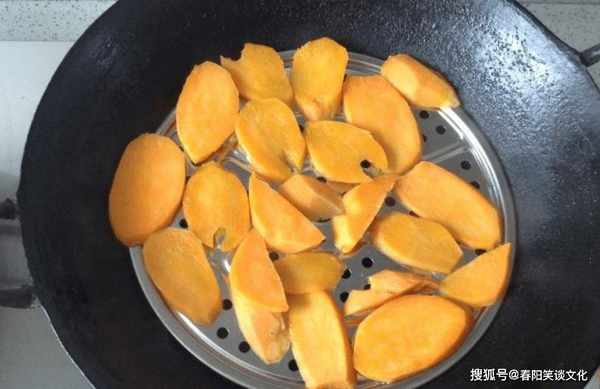 第1步:准备这道甜汤的配料。将两个红薯去皮。将红薯去皮切片。把所有的红薯放在盘子里蒸10分钟。