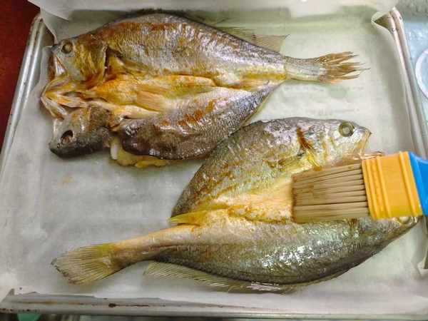 4、我们把初步烤干的黄花鱼端出来,将调好的料汁在鱼的上下两面都刷几遍。