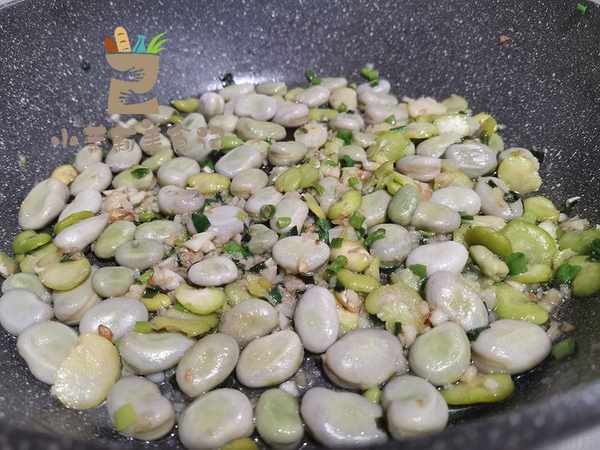 4、把蚕豆倒进锅里,与葱蒜快速翻炒,淋入一点生抽,少许蚝油,继续炒均匀,淋入一些热开水,焖几分钟,保证将蚕豆焖熟。接着把剩余的葱蒜放进去,继续炒香,调入些许的糖和盐,炒入味即可装盘。