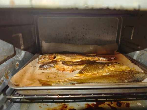 5、接着我们把鱼第二次放到烤箱里边,进一步烤熟,每隔十五分钟就翻一次面,这样可以让鱼熟得更快。一直将鱼肉彻底烤熟,边缘的部分变得焦香。然后把烤盘端出来,可以进一步撒上一些椒盐,挤入一些柠檬汁即可享用。