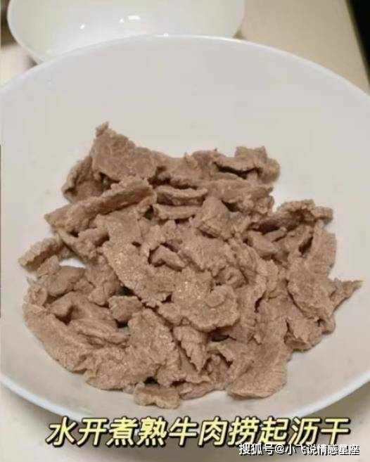 第四步:锅中烧开半锅热水,将牛肉片煮熟,注意不要煮过头,沥干水分,备用。