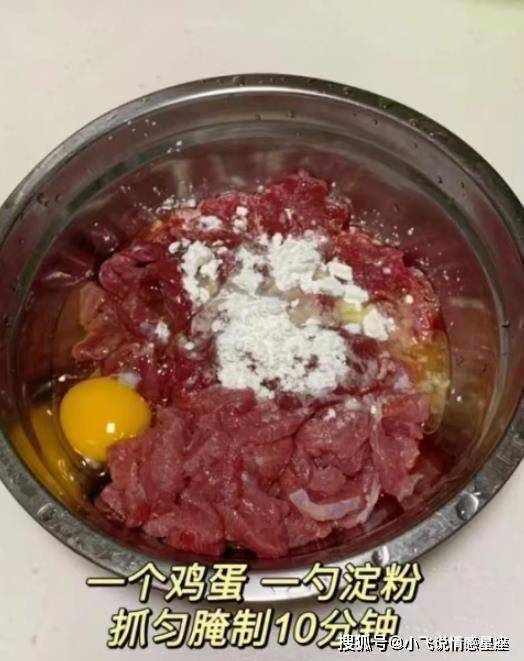 第三步:将嫩牛肉清洗干净,切开筋膜层,将牛里脊肉顺纹切片,将牛肉片放入容器中,打入一个鸡蛋,加少许土豆淀粉,加一勺料酒,放好。少许煎炸油,让牛肉片均匀。