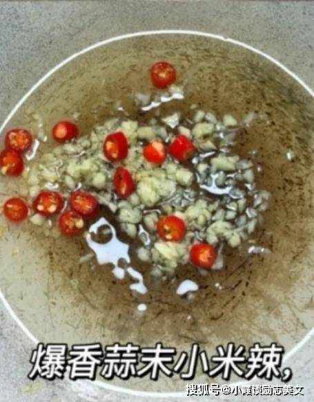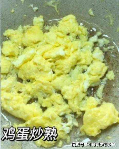 第五:锅底加少许食用油,油烧热,鸡蛋提前煎好,锅里加少许油,加入切碎的蒜和调味好的小米,快速翻炒出蒜香.