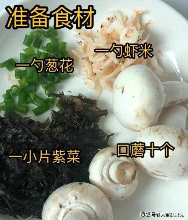 买食材:买优质口蘑200克(口蘑是一种很常见的白蘑菇,形状圆润,非常光滑圆润,有淡淡的清香,我家喜欢用来煲汤),约45克优质口蘑优质虾壳(虾壳是一种含钙丰富的食材,可以加在汤里让孩子获得充足的营养),水适量,小葱少许,香菜2条,紫菜约30克,香油少许还有猪油一勺,酱油一勺,姜几片,盐少许,胡椒粉半勺,鸡精半勺等调料。