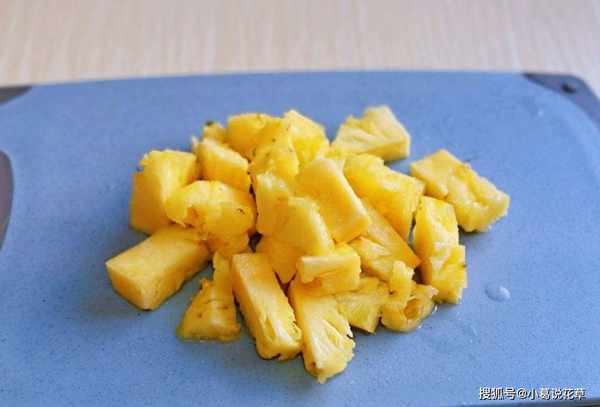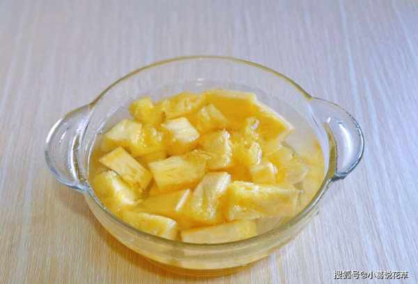 制作步骤5:将购买的菠萝去皮,然后用冷水冲洗干净,菠萝切成小块,将菠萝块放入制作容器中,加少许盐,用水浸泡20分钟,这样就没有了.菠萝可以去掉。蛋白酶物质不会刺激舌头,不会引起过敏反应,反而会使菠萝吃起来更甜。