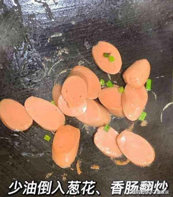 第三步:锅底放少许食用油,放入葱段和姜末,倒入一些火腿肠片,翻炒片刻。