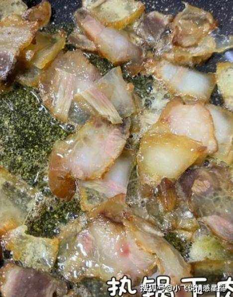 第四步:锅底放少许植物油,放入五花肉,将五花肉的肥油炸出(记得捞出一点多余的油,不然会很肥)