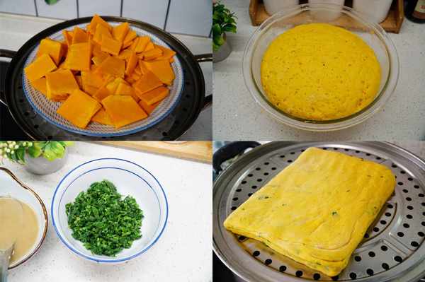 4、南瓜揉搓排气擀成长方形,均匀的刷上油酥、撒上荠菜碎,对半折叠擀开,再次刷上油酥、撒上荠菜碎,对半折叠,循环几次放入蒸锅中,再次发酵15分钟蒸熟。