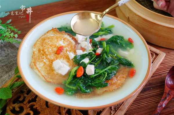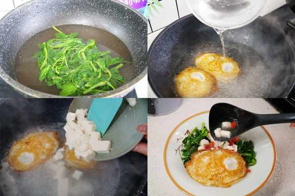 准备食材:豌豆尖、鸡蛋、内脂豆腐。