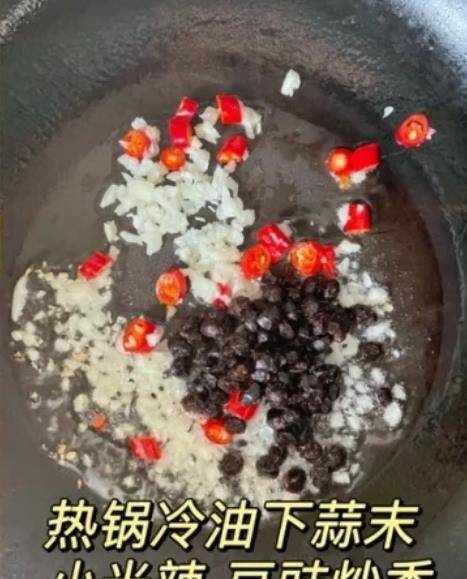 第三步:锅底预热,加入少许植物油和猪油,加入蒜末炒出蒜香,少许辣小米和豆豉加入豆角炒香。来自发酵大豆。