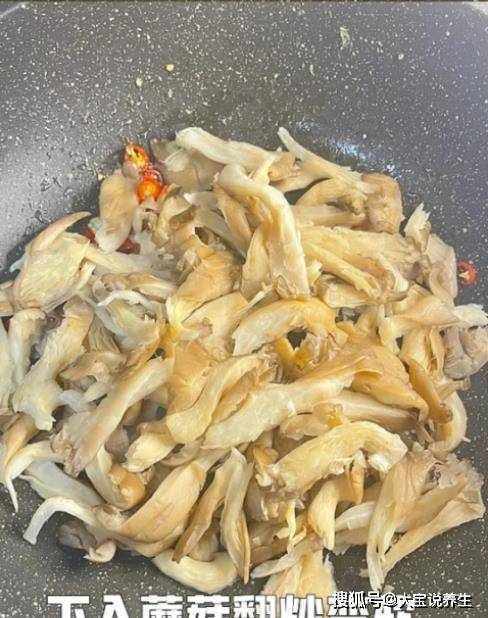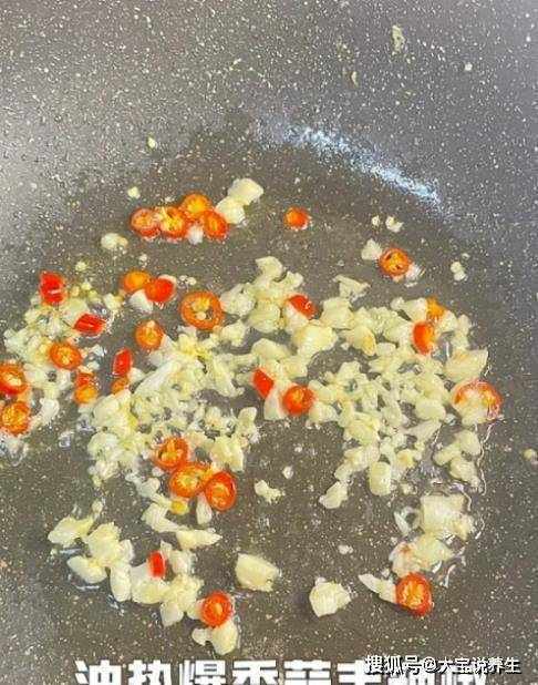 5:锅中继续加油,加入蒜末和辣椒小米,翻炒30秒左右,加入平菇炒软沥干水分。