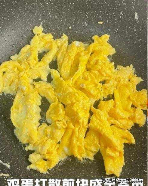 4:锅底加一滴油,将蛋液倒入锅中炸至金黄,切块,炸成小块备用。