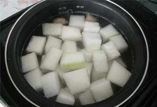 烹饪步骤三:冬瓜去皮,冬瓜肉切块待用,生姜、小葱切段洗净切块待用。