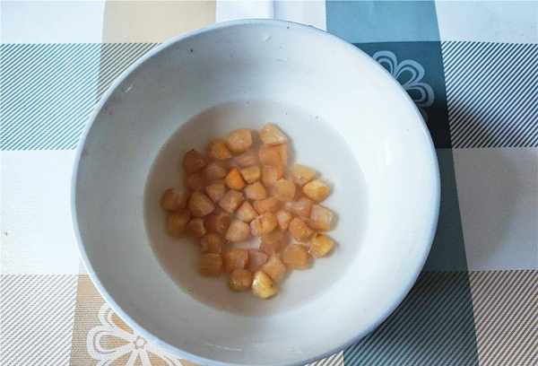 烹调步骤4:将干贝洗净,放入碗中,加入少许温水和料酒,浸泡约30分钟,至干贝全部浸透,干贝可增加鲜度。