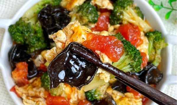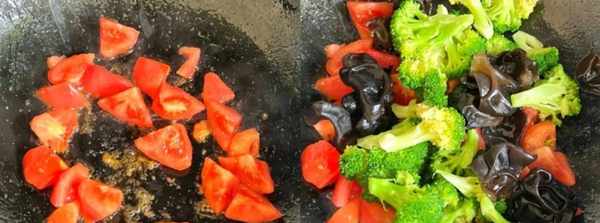 步骤5:另外起锅加上油,油热倒入西红柿块,迅速炒出汁水来,依次加上西兰花和黑木耳,均匀翻炒片刻。