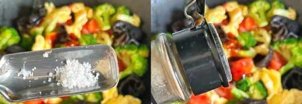 第七步:锅内放少许生抽和蚝油,撒少许盐和胡椒粉,用锅铲快速翻炒,装盘即可食用。