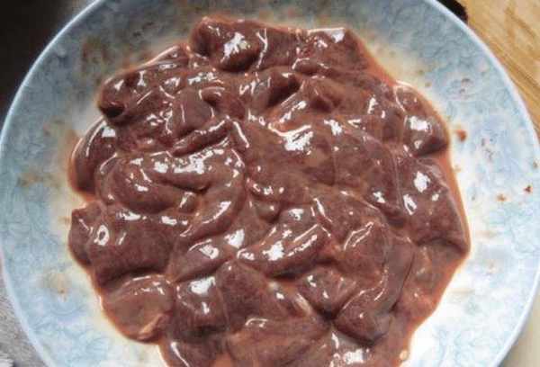 烹饪步骤2:将猪肝片放入碗中,加入料酒,加入药明,撒盐,再加入生粉抓住,这样猪肝的营养就被锁住了,口感更佳。变软后,腌制15分钟以上,去除猪肝腥味。
