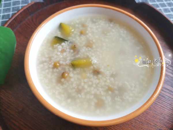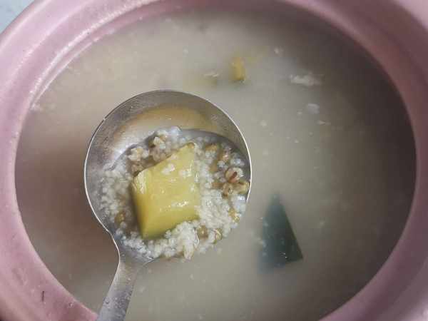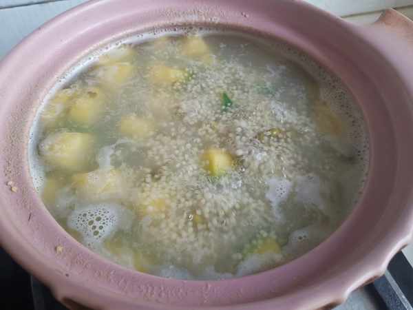 第四步:把砂鍋放入清水,加入綠豆燒開,然後加入小米和南瓜,改成小火慢慢熬煮20分鐘。